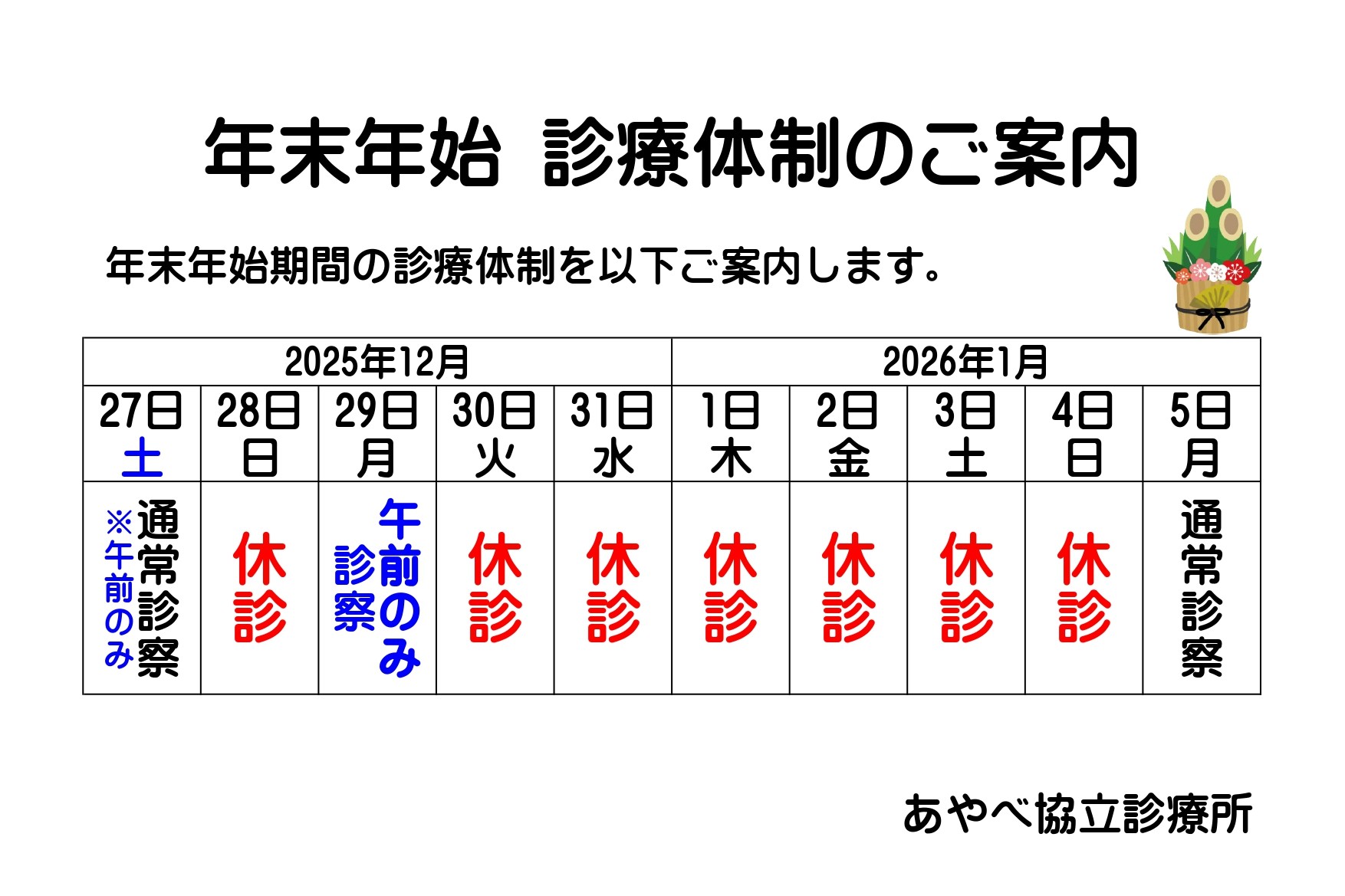 2025-12-13 / 最終更新日 : 2025-12-13 master ご案内 「年末年始 診療体制のご案内」を掲載(更新)しました 訪問看護師募集 -在宅ケアステーションげんき- 在宅ケアステーションげんきから訪問看護に挑んでみませんか、ホームケアに“元気”をすみずみまで FacebookXBlueskyHatenaCopy