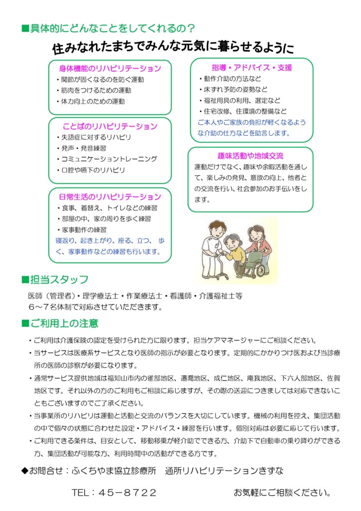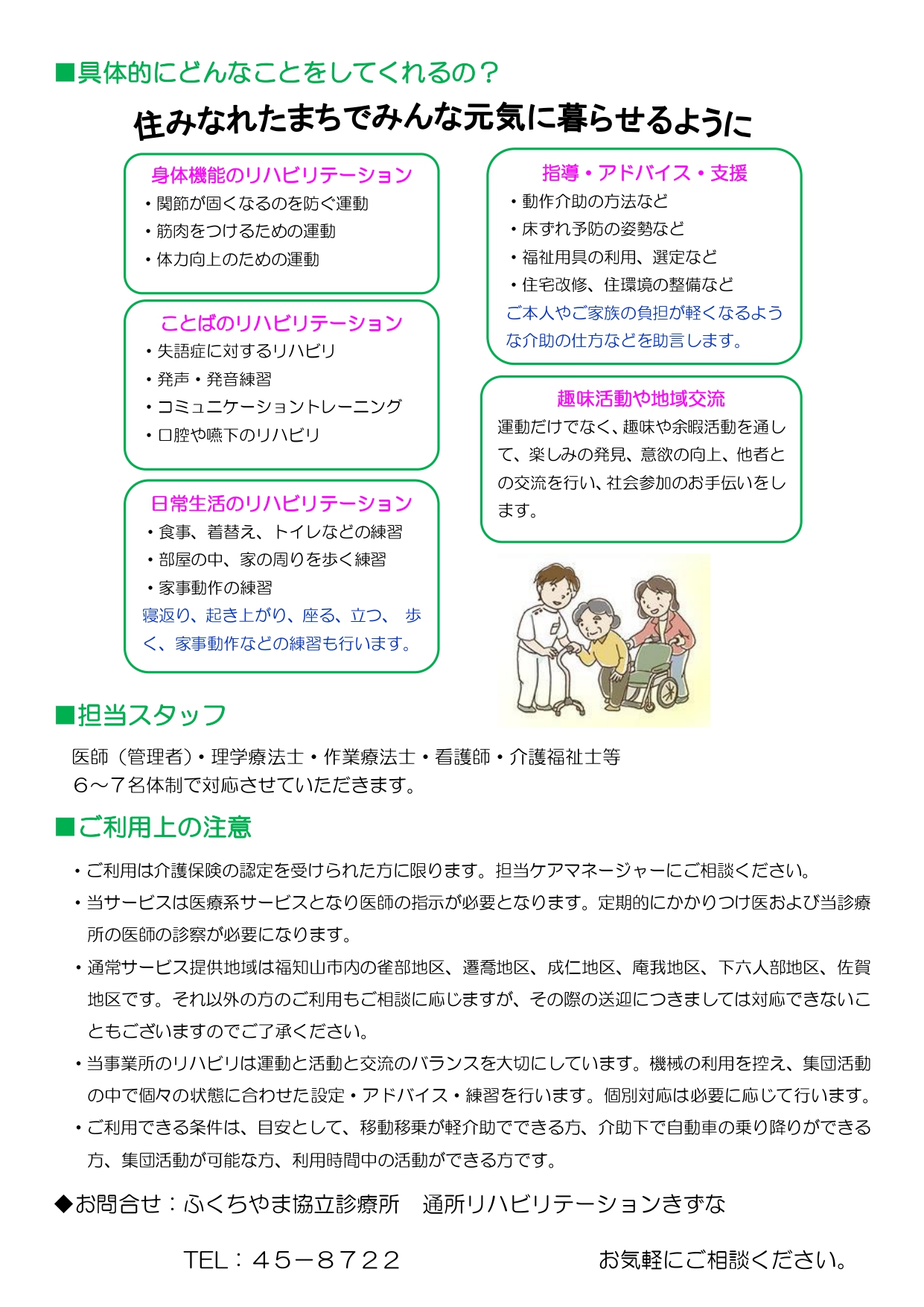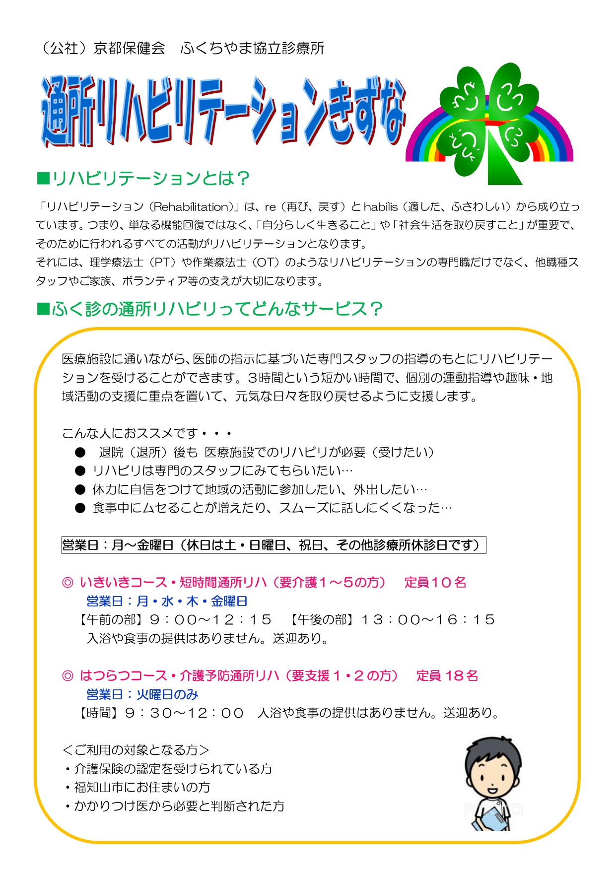 | 営業日・ 営業時間 | いきいきコース・短時間通所リハ(要介護1~5の方) 月・水・木・金曜 【午前の部】9:00~12:15 【午後の部】13:00~16:15 ※入浴や食事の提供はありません、送迎あり はつらつコース・介護予防通所リハ(要支援1、2の方) 火曜 9:30~12:00 入浴や食事の提供はありません、送迎あり |