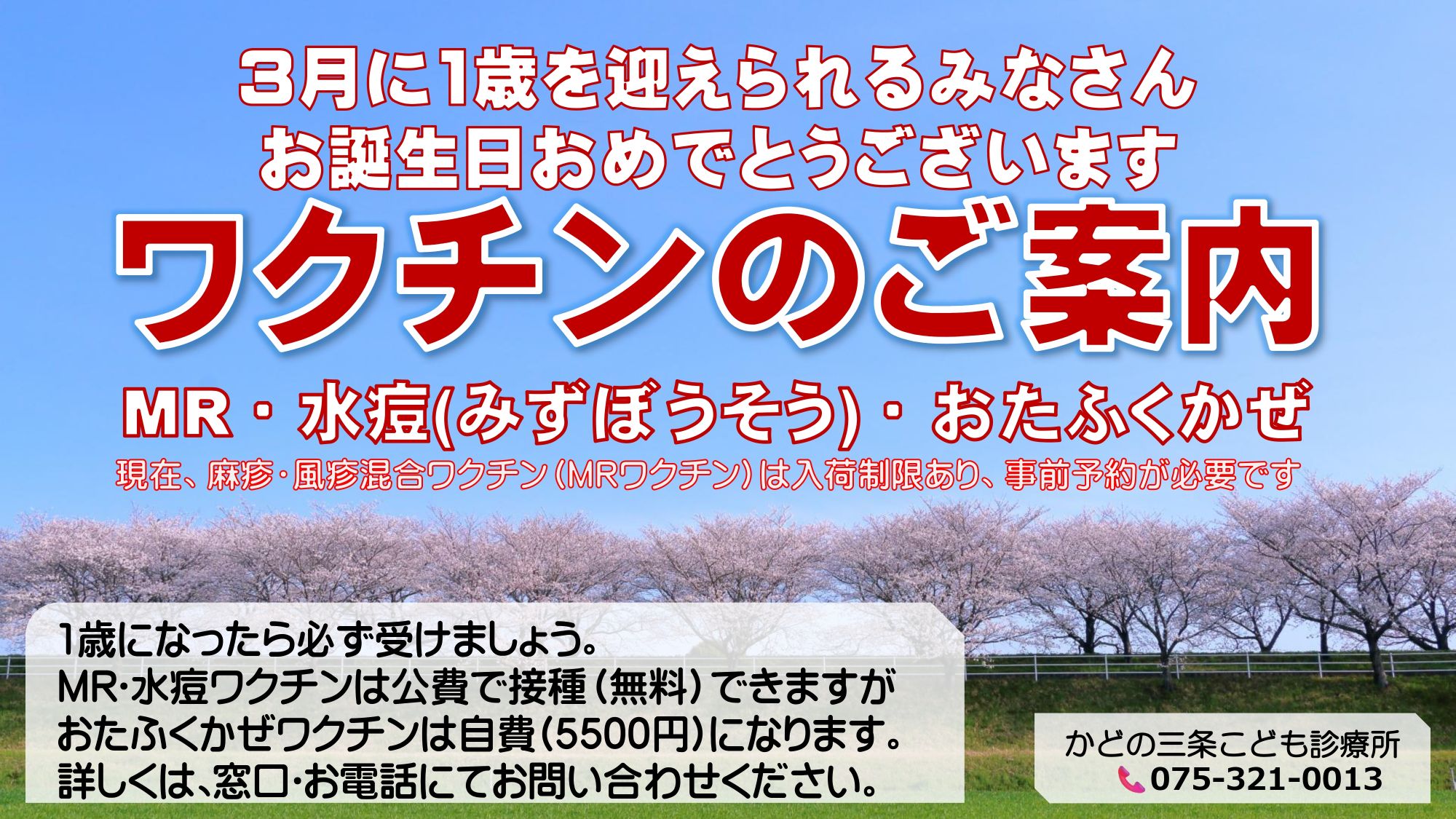 2026-03-02 / 最終更新日 : 2026-03-02 master ワクチン情報 3月に1歳を迎えられるみなさん ワクチン接種情報はこちらVACCINE MARCHE KADONO ネット受付をご利用くださいませ診察順、ワクチン予約です。 午前、夜の診察は、当日診察順番受付を 午後のワクチン外来は、24時間ネット受付で ネット受付 診察順、ワクチン予約FacebookXBlueskyHatenaCopy