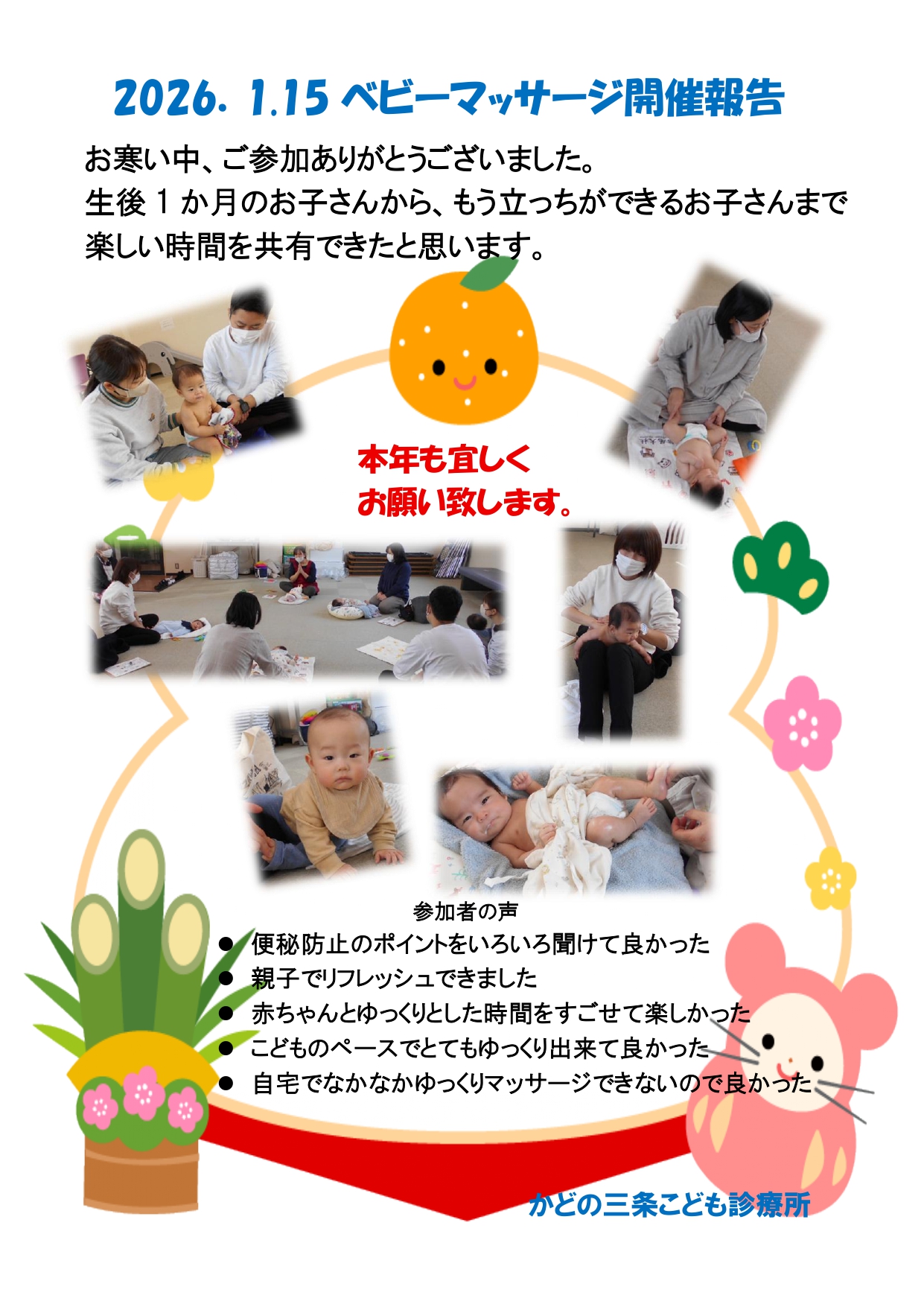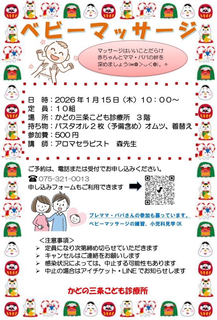2026-01-17 / 最終更新日 : 2026-01-23 master 子育て懇談会 ベビーマッサージ(1/15)開催報告を掲載しました ネット受付をご利用くださいませ診察順、ワクチン予約です。 午前、夜の診察は、当日診察順番受付を 午後のワクチン外来は、24時間ネット受付で ネット受付 診察順、ワクチン予約FacebookXBlueskyHatenaCopy