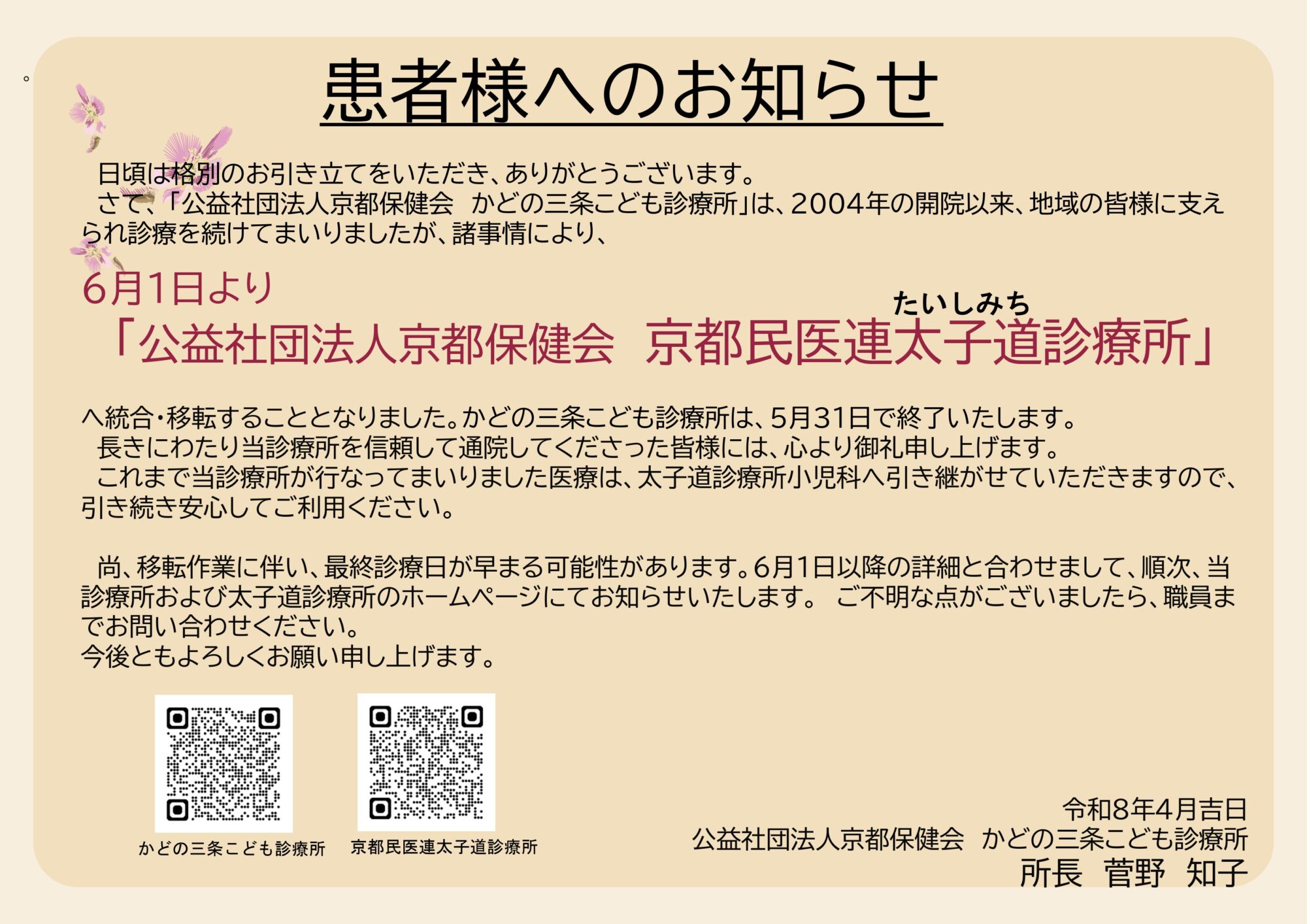 2026-04-02 / 最終更新日 : 2026-04-02 master ご案内 太子道診療所へ統合・移転(6/1)します ネット受付をご利用くださいませ診察順、ワクチン予約です。 午前、夜の診察は、当日診察順番受付を 午後のワクチン外来は、24時間ネット受付で ネット受付 診察順、ワクチン予約FacebookXBlueskyHatenaCopy