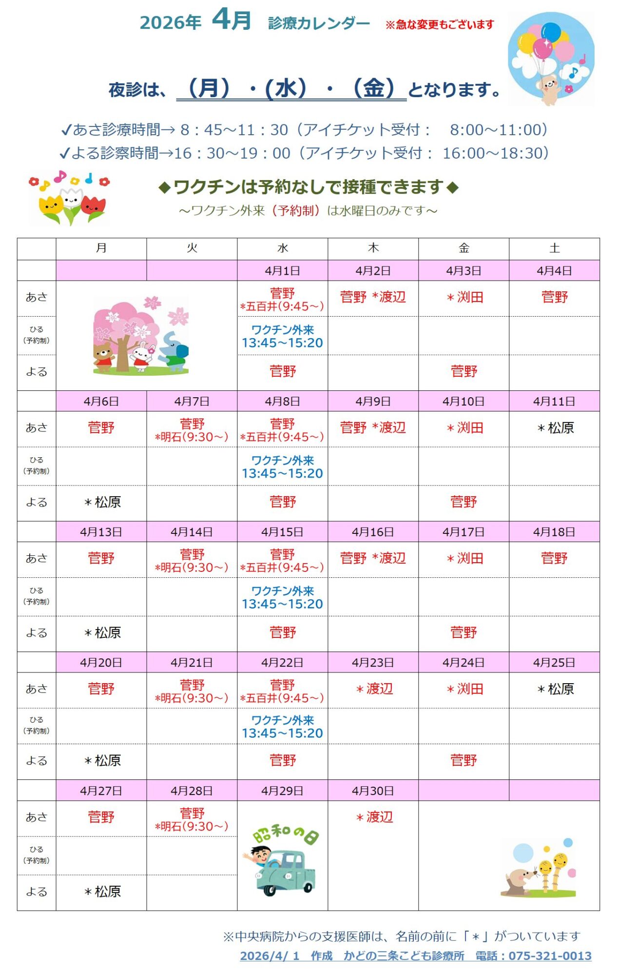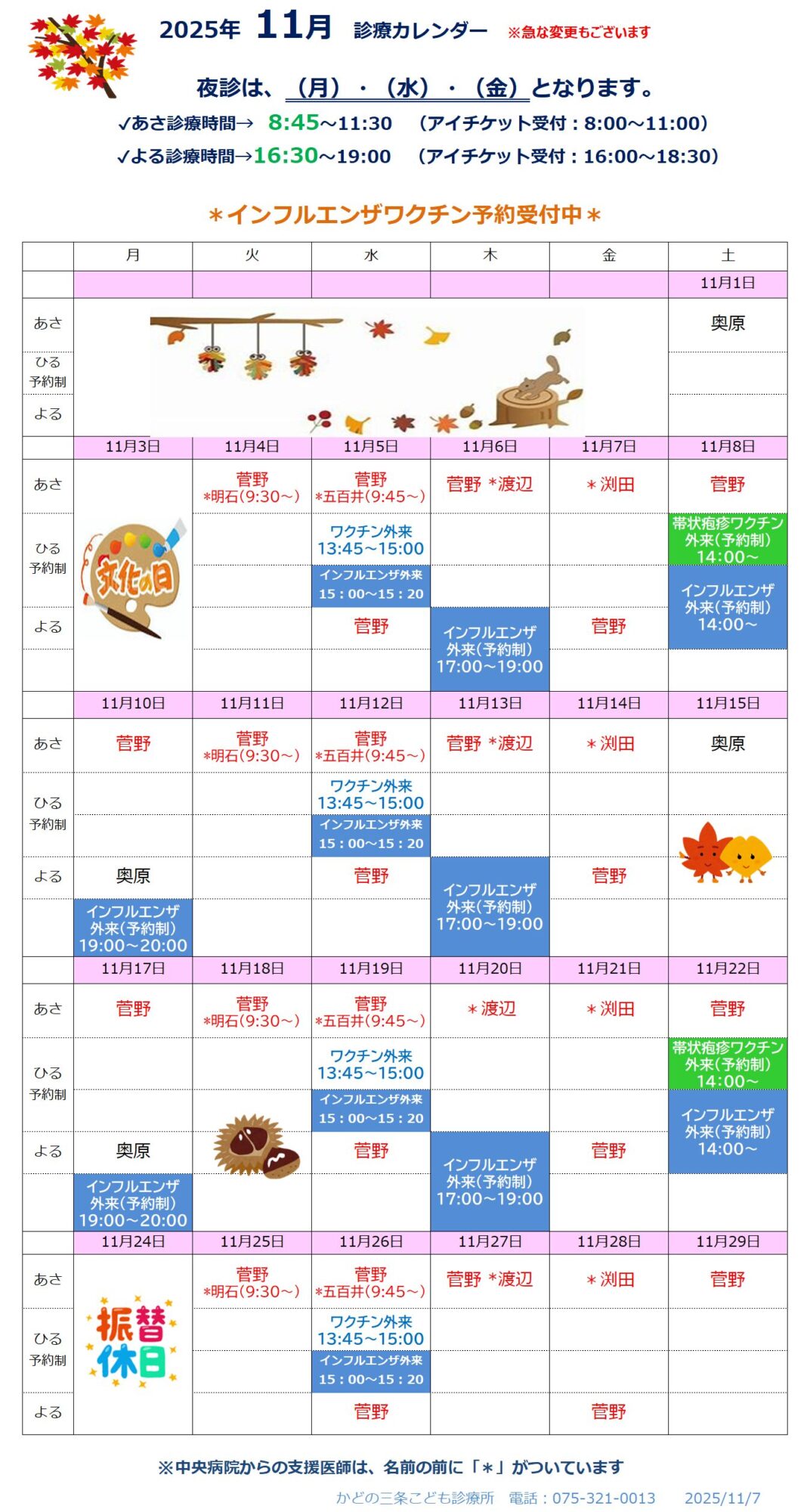 お気軽にお問い合わせくださいませ。075-321-0013診察・受付時間内にお願いします。 ネット受付はこちら 診察順、ワクチン予約、初診申込の3種ですネット受付をご利用くださいませ診察順、ワクチン予約です。 午前、夜の診察は、当日診察順番受付を 午後のワクチン外来は、24時間ネット受付で ネット受付 診察順、ワクチン予約FacebookXBlueskyHatenaCopy