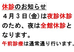 午前、夜の診察は、以下の時間帯にご利用ください。 午後は予約制です。