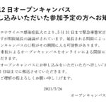 2022-07-30 / 最終更新日 : 2022-07-30 master ご案内 8/6のミニオープンキャンパスは中止します 8月6日(土)のミニオープンキャンパスは、新型コロナウイルス感染症拡大のため中止とさせていただきます。