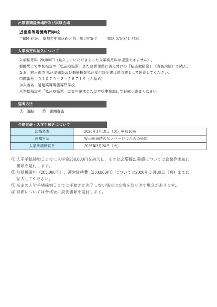 口座番号:01070-2-28719(右詰め) 加入者名:近畿高等看護専門学校
