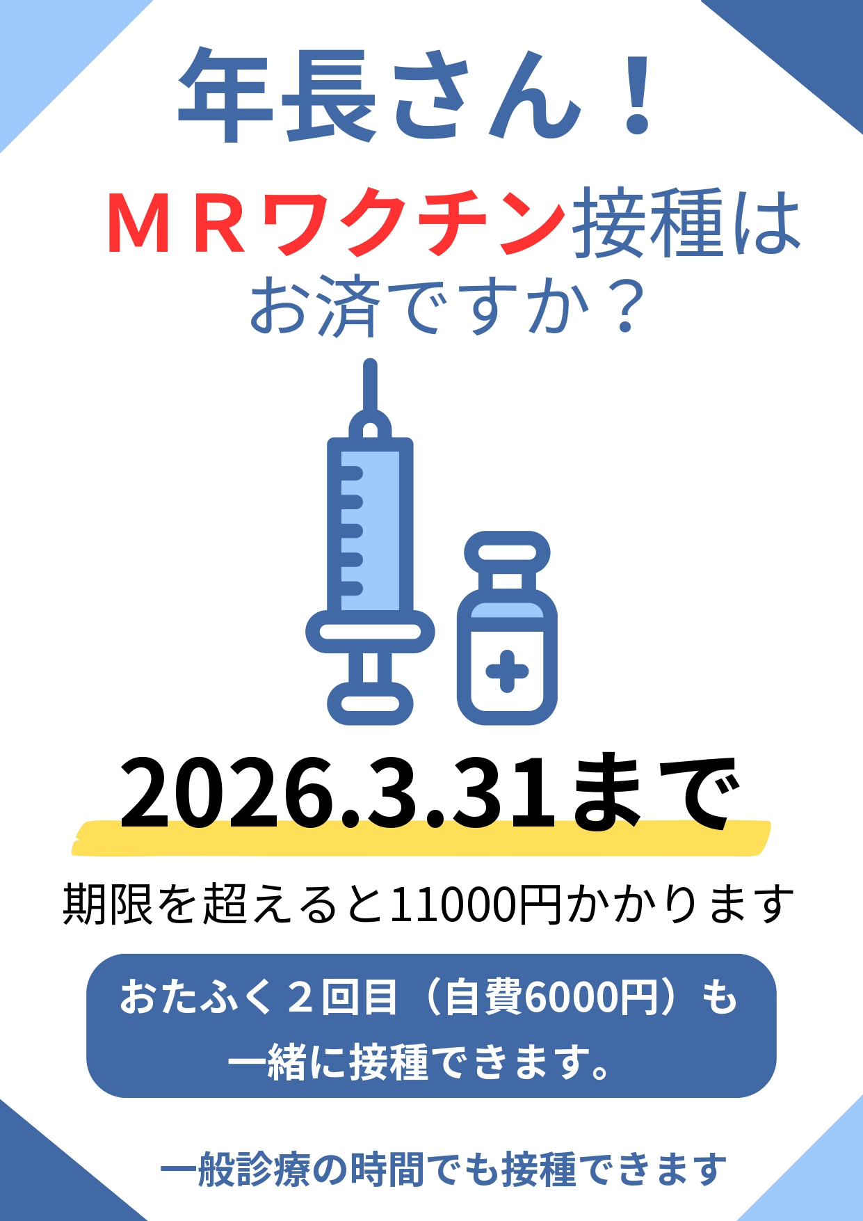 2026-02-27 / 最終更新日 : 2026-02-27 master ワクチン情報 年長さん!MRワクチン接種はお済ですか? ワクチン情報ワクチンで防げる病気(VPD)は20近くあり、必要なワクチン接種を積極的にすすめています。 日本のワクチン環境はここ数年で急速に世界水準に近づき、生後2ヶ月で開始、1歳までに大切なワクチンが目白押しです。最新に整理したワクチン情報をご覧ください。 ワクチン情報はこちら FacebookXBlueskyHatenaCopy