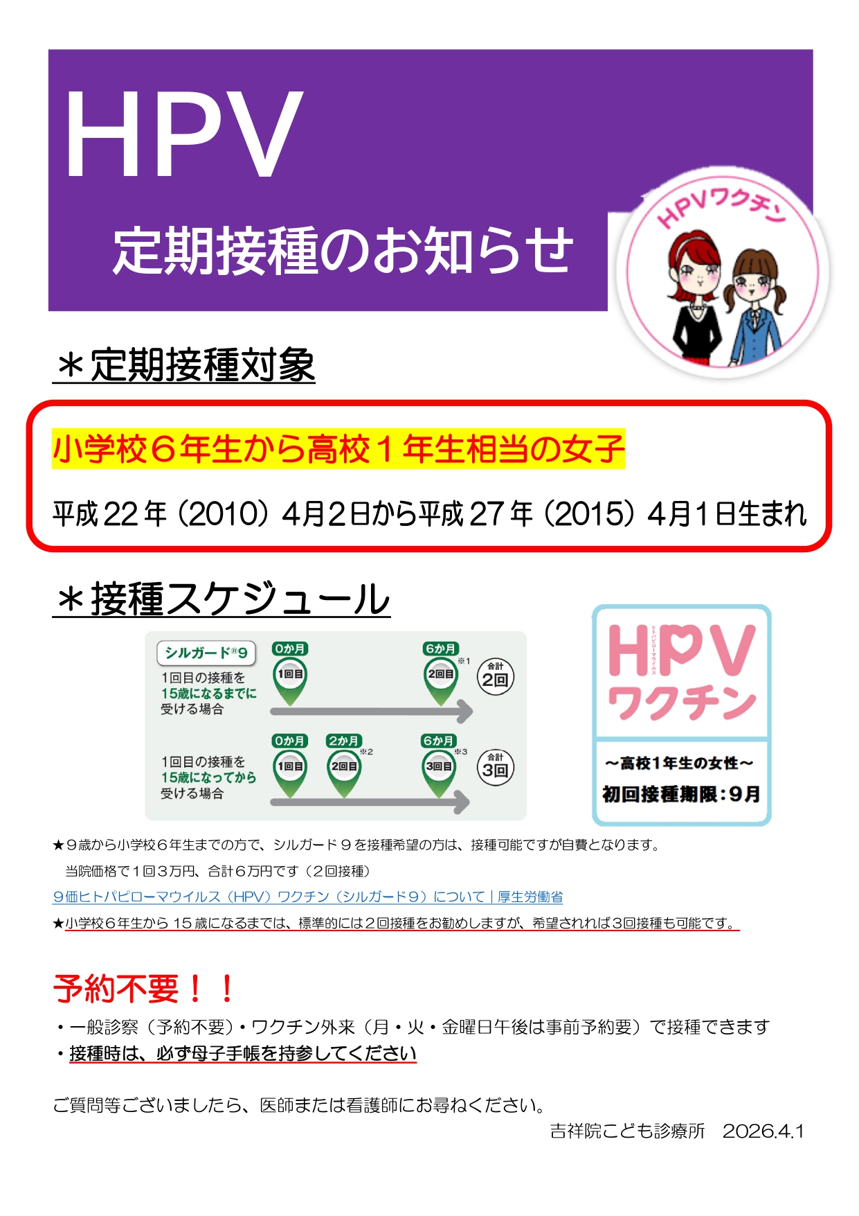 2026-04-06 / 最終更新日 : 2026-04-06 master ワクチン情報 HPV定期のお知らせ 診察休診、ワクチン外来休診等のご案内 ■4/10(金) 午前診 森山所長休診→代診渡辺医師 午後ワクチン外来、夜の外来は休診です。 診療担当医表はこちら FacebookXBlueskyHatenaCopy