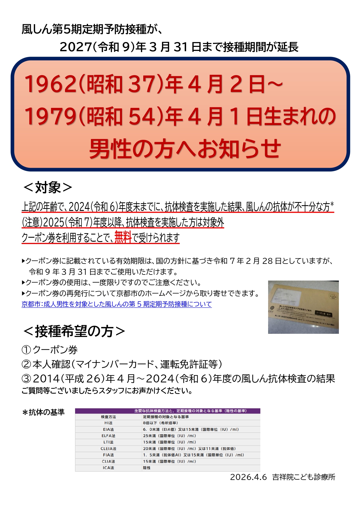 2026-04-06 / 最終更新日 : 2026-04-06 master ワクチン情報 風しん第5期定期予防接種の期間延長 ワクチンサポート「ワクチンサポート」を取り組んでいます。 ワクチン外来予約■ 月・火・金曜:15分単位で予約 Vaccine Services for Babies / Toddlers■ English版 ワクチンサポートサービスはこちら FacebookXBlueskyHatenaCopy