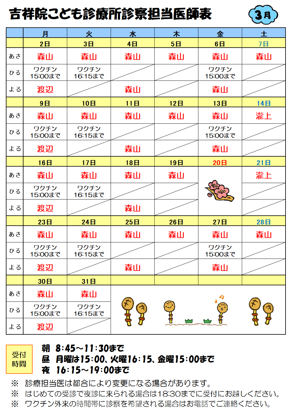2026-02-26 / 最終更新日 : 2026-02-26 master ご案内 3月の診察担当医師表 掲載しました 他の月分は、こちらをご覧ください FacebookXBlueskyHatenaCopy