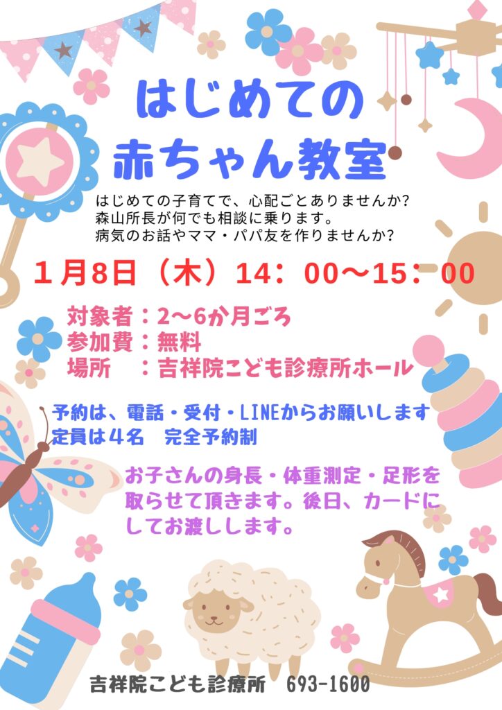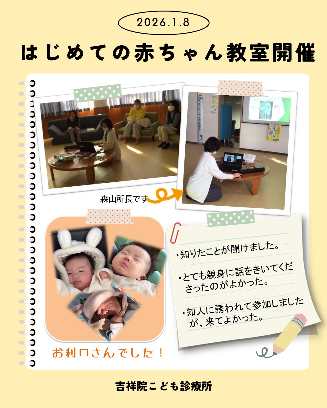2026-01-08 / 最終更新日 : 2026-01-08 master 子育てEvents はじめての赤ちゃん教室(1/8)開催報告を掲載しました 診察休診、ワクチン外来休診等のご案内 ■1/30(金) 午前診 森山所長休診→代診渡辺医師 午後ワクチン外来、夜の外来は休診です。■2/20(金) 午前診 森山所長休診→代診渡辺医師 午後ワクチン外来、夜の外来は休診です。 診療担当医表はこちら FacebookXBlueskyHatenaCopy
