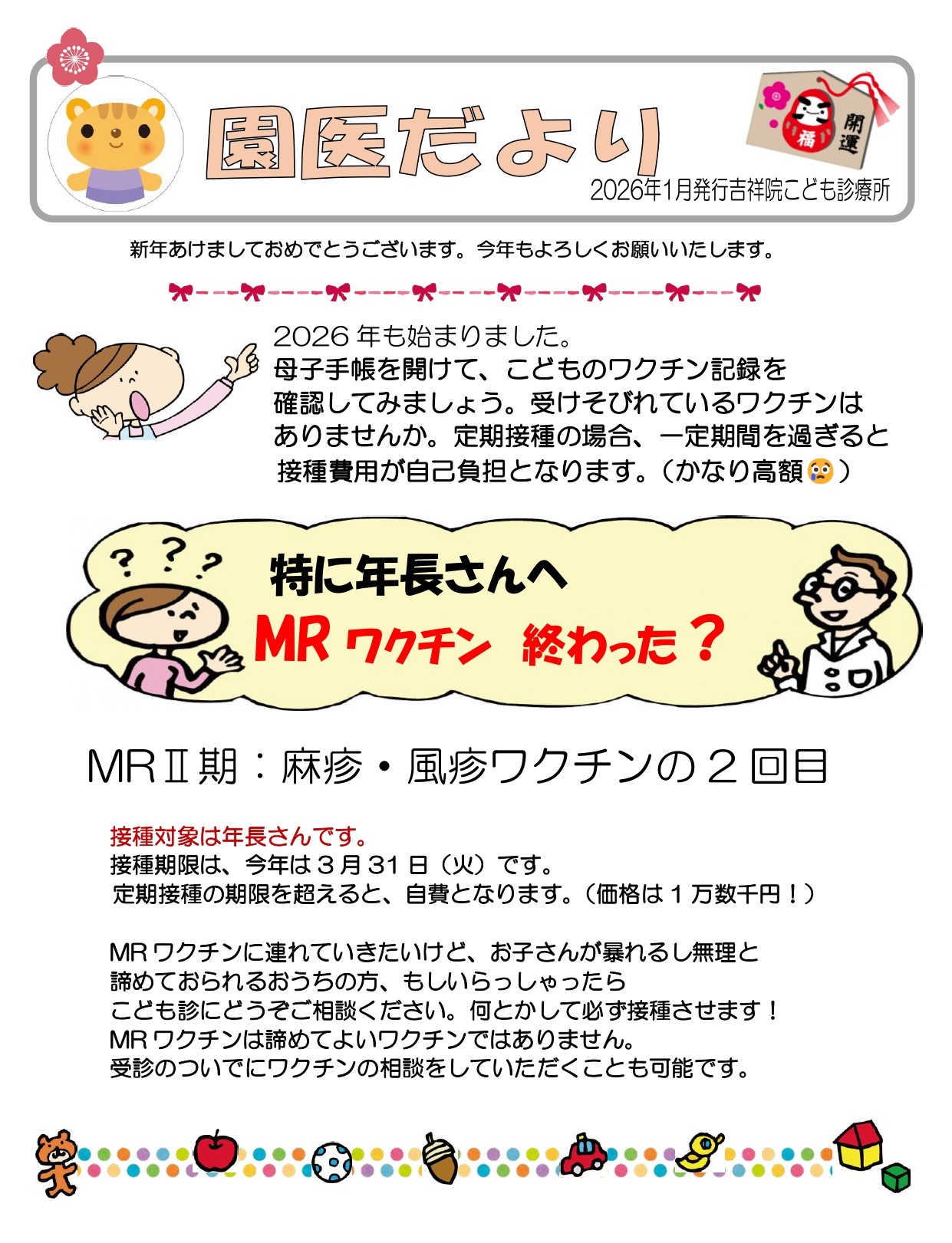 2026-01-07 / 最終更新日 : 2026-01-07 master 園医だより 園医だより2026/1月号「特に年長さんへ MRワクチン終わった?」を掲載しました ワクチン情報ワクチンで防げる病気(VPD)は20近くあり、必要なワクチン接種を積極的にすすめています。 日本のワクチン環境はここ数年で急速に世界水準に近づき、生後2ヶ月で開始、1歳までに大切なワクチンが目白押しです。最新に整理したワクチン情報をご覧ください。 ワクチン情報はこちら FacebookXBlueskyHatenaCopy