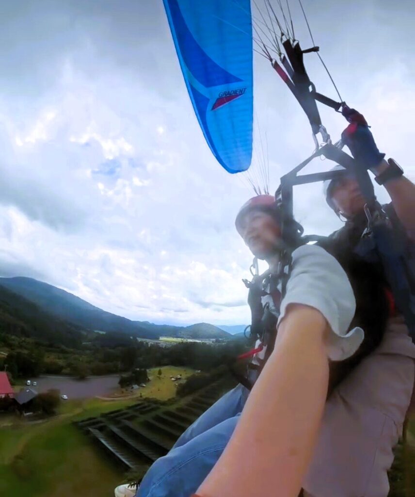 ずぅーっとしてみたかったパラグライダー、兵庫神鍋高原で体験フライト(インストラクターと飛ぶタンデムフライト)してきました。少し説明を受け、リフトに乗って山の中腹へ。そこで装具を装着し飛ぶための指導を受けます。下を見下ろし指で指しながら「あの辺り、あそこを見て思いっきり走って。そこ左側に草むらになってるからそっちに向かったらあかんよ」